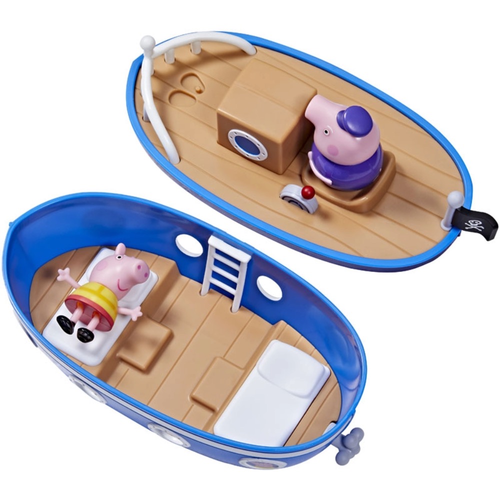 Dækket (med fastgjort Bedstefar Gris-figur) kan fjernes og afslører en hyggelig kahyt nedenunder med indbyggede køjer og en sød lille stige.